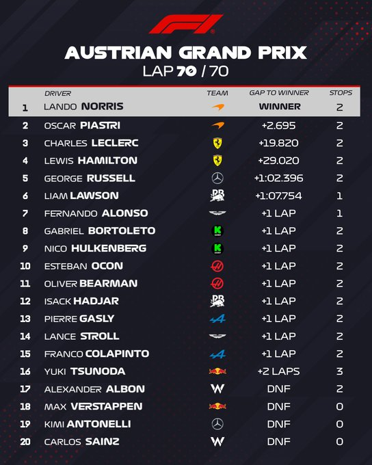 C’est la première victoire de McLaren en Autriche depuis celle de David Coulthard en 2001.