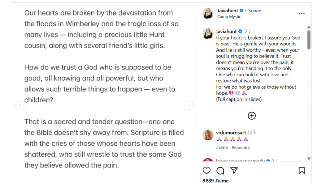«Nos coeurs sont brisés à la suite de la dévastation causée par les inondations (…) et les pertes de plusieurs vies – incluant une précieuse petite cousine Hunt, ainsi que plusieurs filles de mes amis», a-t-elle précisé sur son compte Instagram.