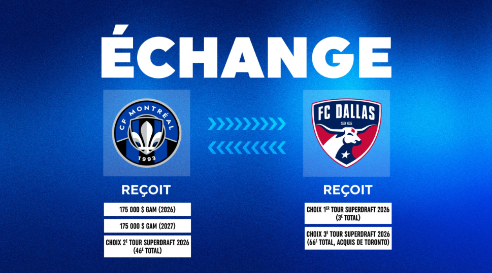 Le CF Montréal a annoncé mardi l’acquisition de 350 000 $ en argent d’allocation générale (GAM), ainsi qu’un choix de deuxième tour au SuperDraft MLS 2026 (46e au total) en provenance du FC Dallas, en échange d’un choix de premier tour du SuperDraft 2026 (3e au total) et d’un choix de troisième tour 2026 précédemment acquis (de Toronto FC, 66e au total).