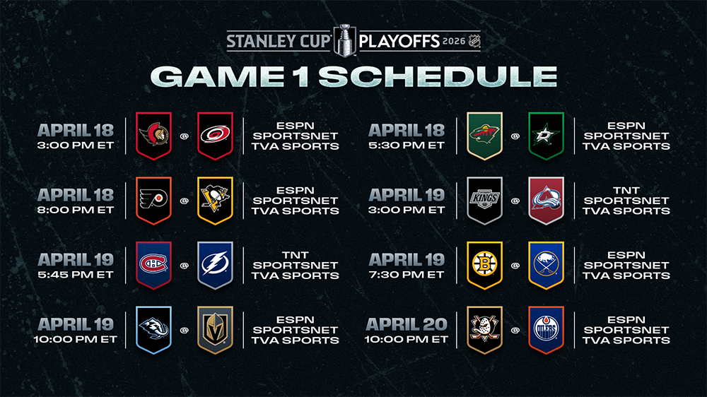Les Bruins de Boston, qui ont obtenu la première place de repêchage dans l’Est, se rendront chez les Sabres de Buffalo, champions de la division Atlantique (19 h 30 HE ; ESPN, SN360, TVAS, NESN, MSG-B) ; et le Mammoth de l’Utah, première équipe repêchée dans l’Ouest, jouera contre les Golden Knights de Vegas, champions de la division Pacifique (22 h HE ; ESPN, SN, CBC, TVAS, Utah16, SCRIPPS).